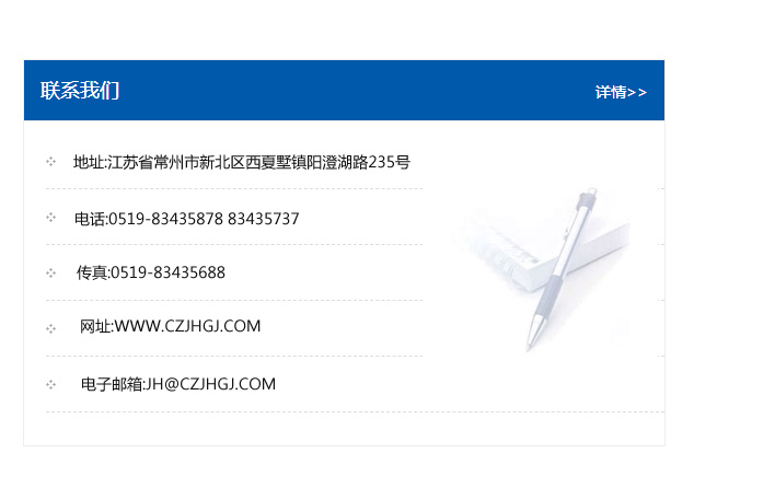 地址:常州市新北區友邦商務大廈1幢16、17層  電話:0519-85101652  傳真:0519-85112595  郵編:213022  網址:www.cz-jiayue_cn.hunyinceshi.com  郵箱:xiajifengaa@163.com